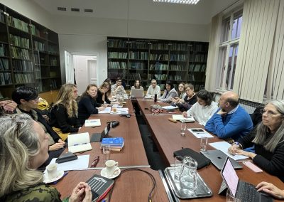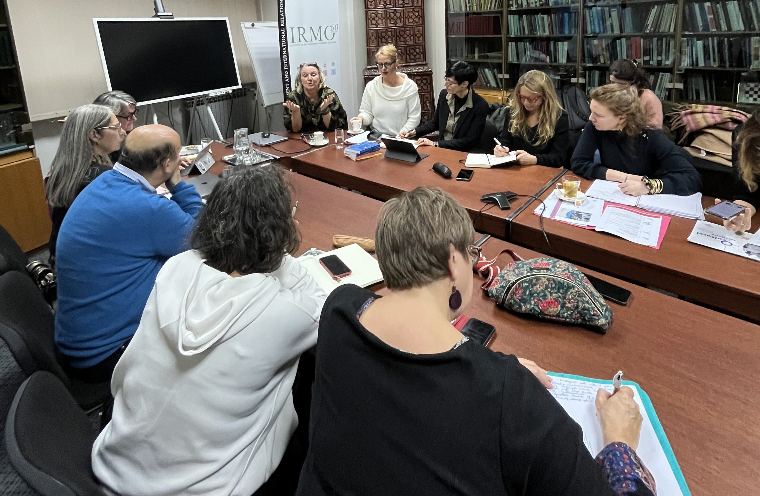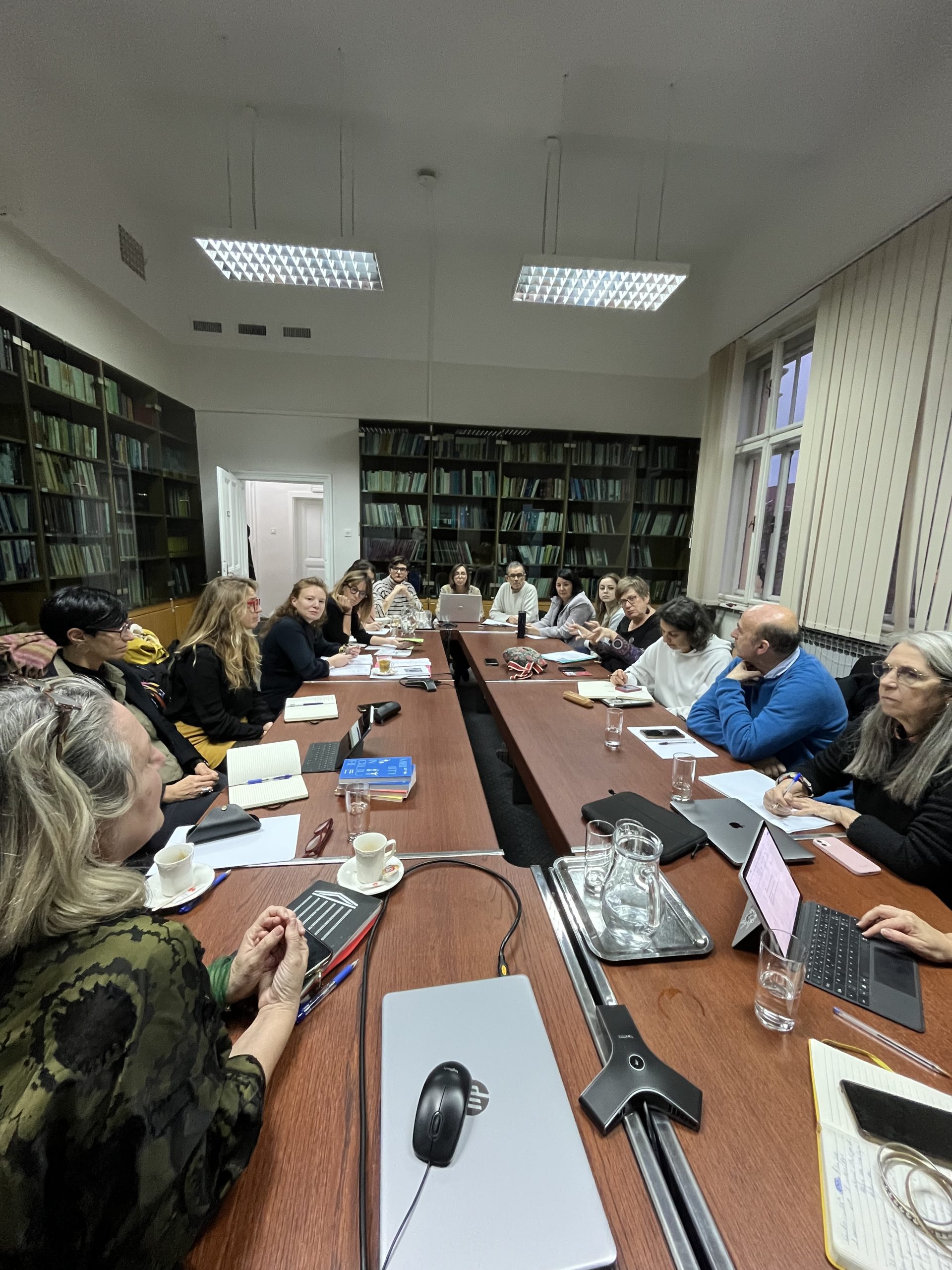 Suradnice na projektu CULTMED, dr. sc. Aleksandra Uzelac, dr. sc. Ana Žuvela i dr. sc. Dea Vidović, ugostile su u srijedu, 19. studenoga 2025., u knjižnici IRMO-a predstavnike francuske mreže FNADAC (Fédération nationale des directrices et directeurs des affaires culturelles). Francusku delegaciju činilo je petnaestak ravnatelja i suradnika gradskih i regionalnih odjela za kulturu, predstavnika organizacija civilnoga društva te Pascale Bonniel-Chalier, savjetnica FNADAC-a, stručnjakinja za kulturne politike i lokalni kulturni razvoj te predavačica na Master programu Development of International Artistic and Cultural Projects na Sveučilištu Lyon II. Delegacija je boravila u Zagrebu od 18. do 21. studenoga u sklopu studijskog posjeta posvećenog upoznavanju lokalnih kulturnih institucija i praksi.